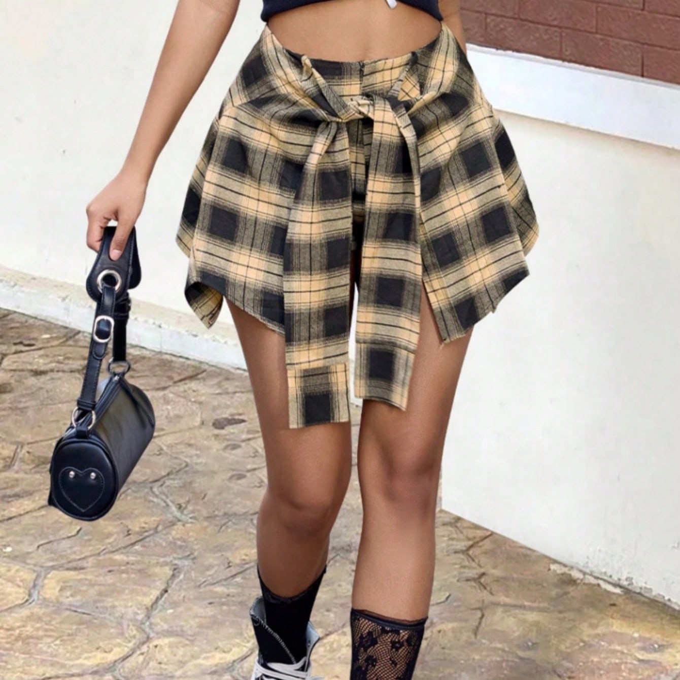 Women's Yellow & Black Plaid Oversized Shirt Shorts - Tied-Waist Casual Button-Down Shorts, Stylish Streetwear & Daily Outing Wear