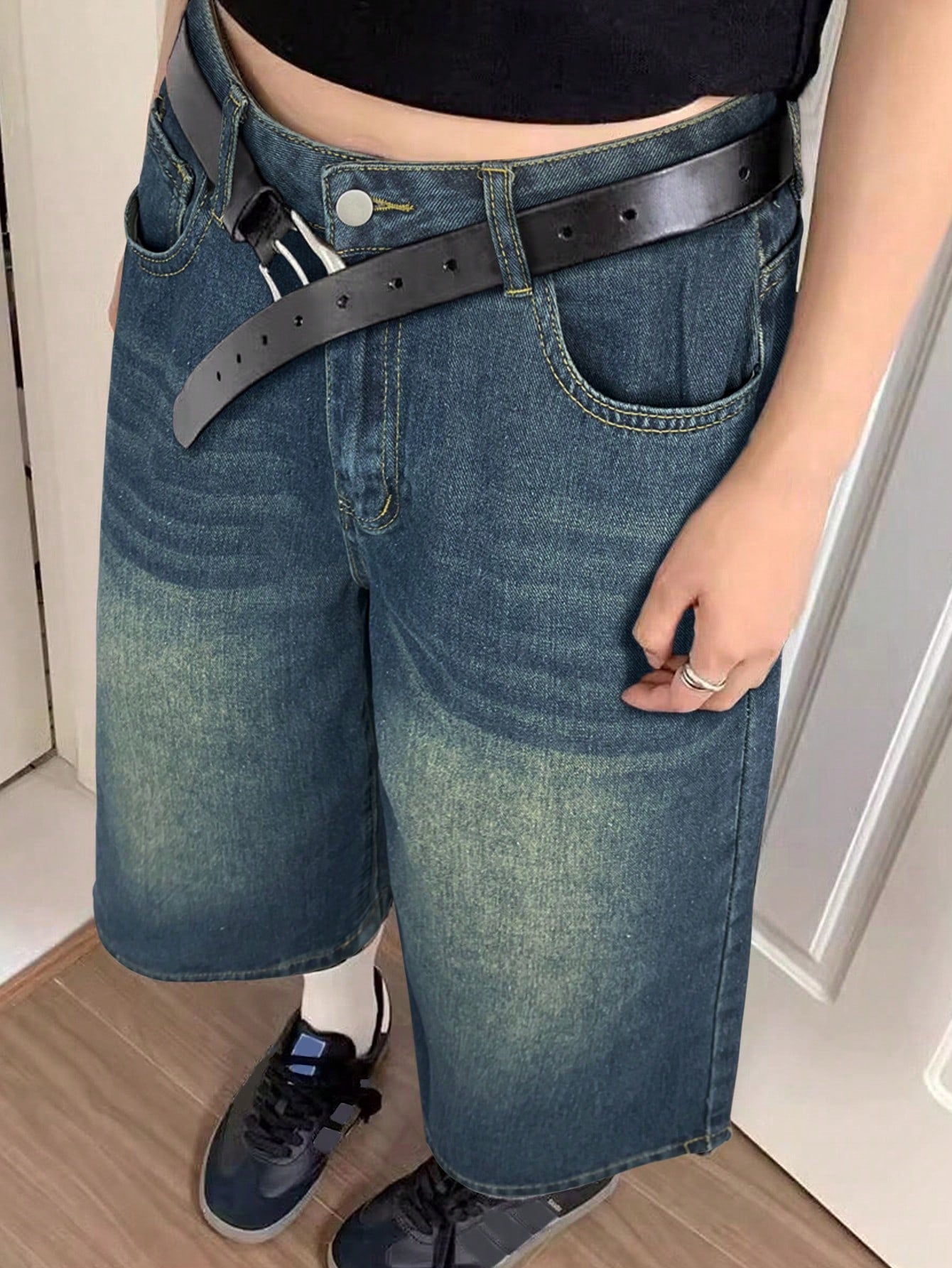 Blue Denim Wide-Leg Culottes - High-Waisted Cropped Baggy Jeans with Belted Waist