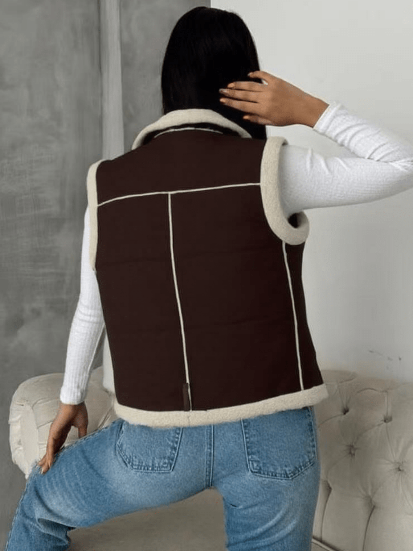 Design Details: Features a sleeveless vest silhouette, shearling detailing, and a two-tone brown and beige color scheme that offers a timeless, trendy appeal.