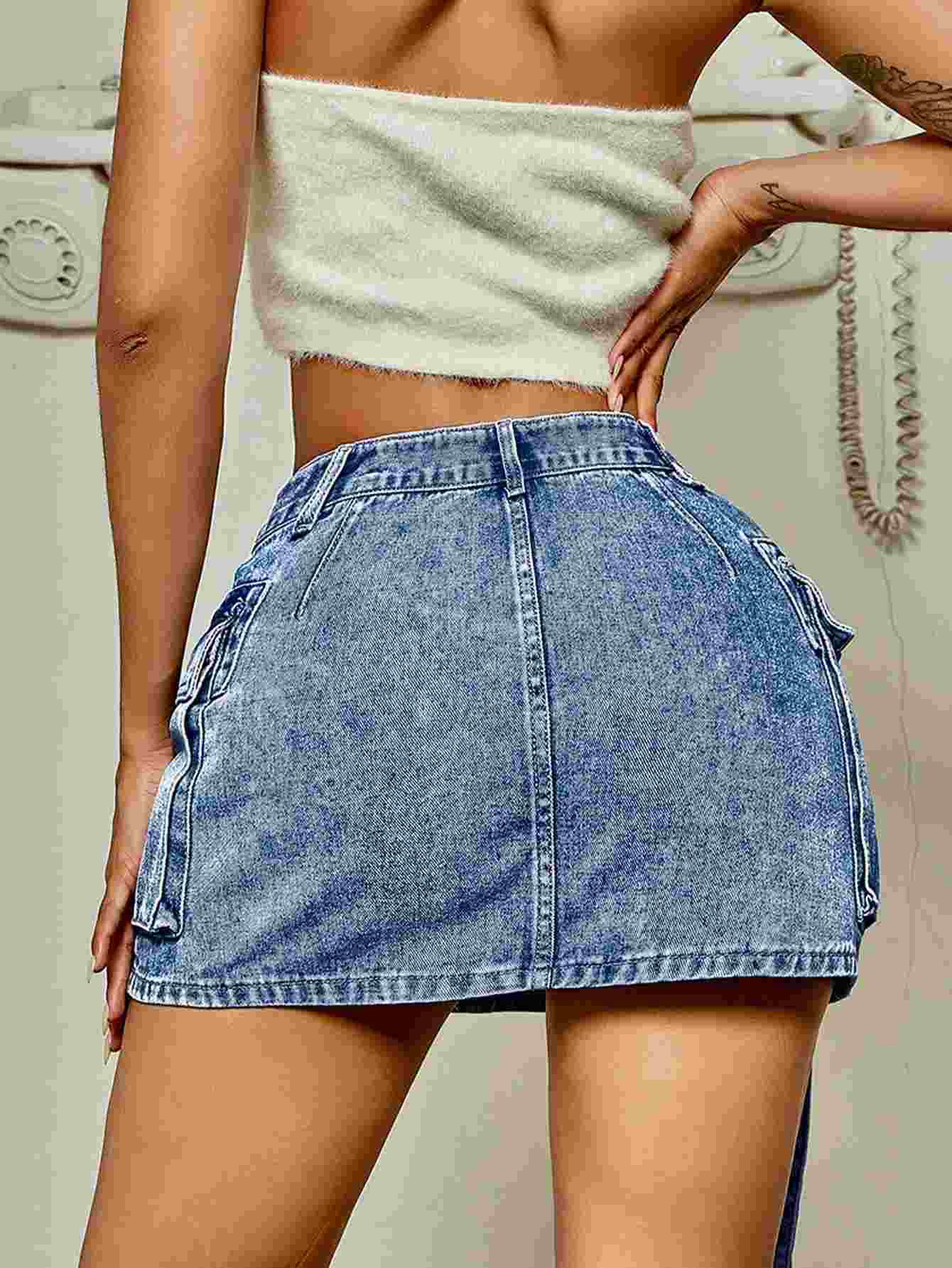 Women's Distressed Washed Cargo Denim Mini Skirt - Vintage Tie-Waist Slim-Fit A-Line Skirt
