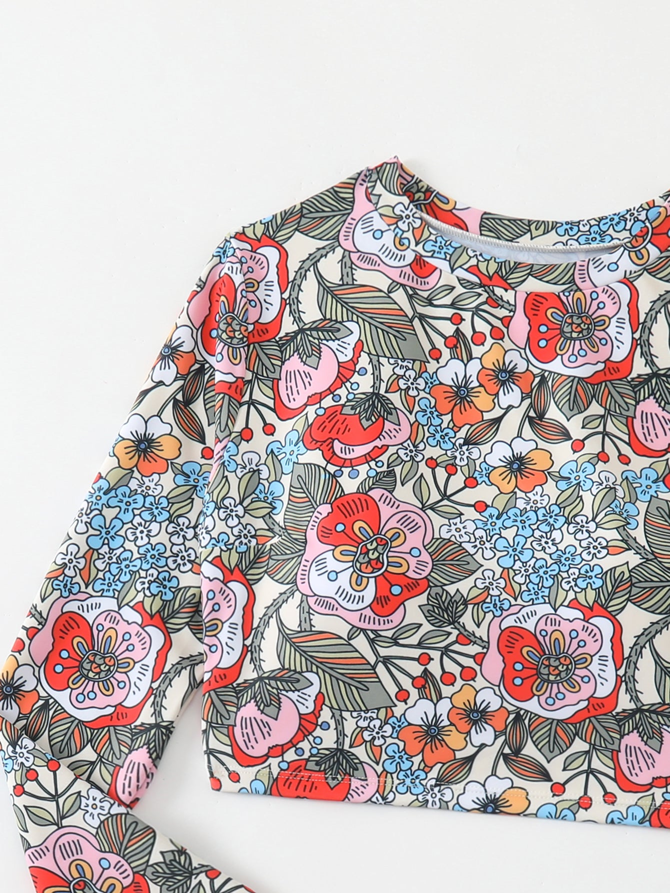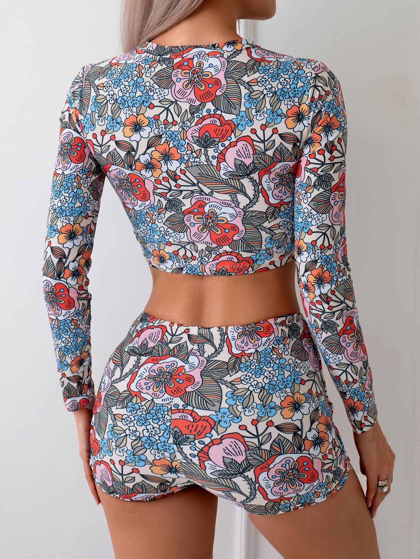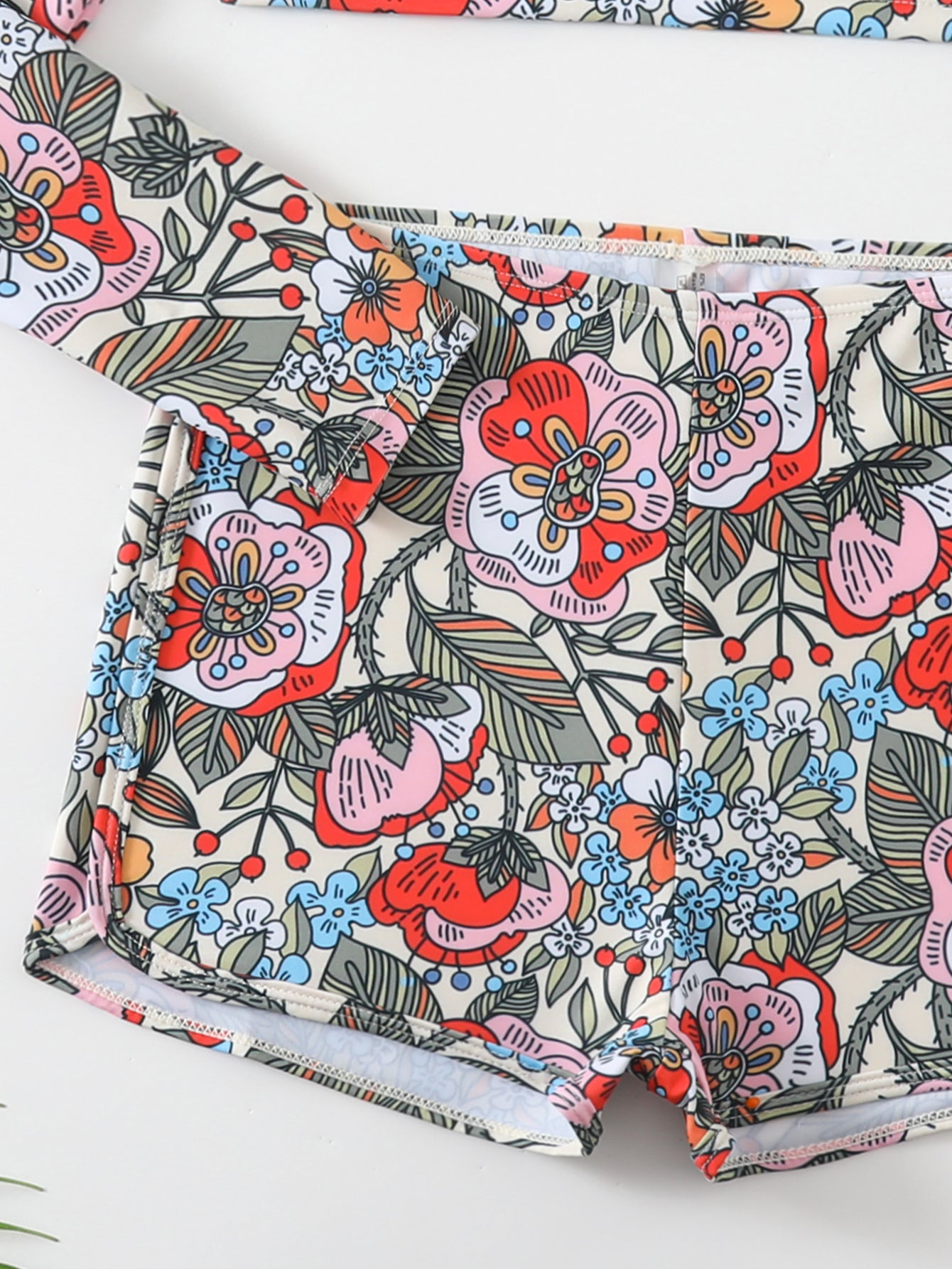 Women's Floral Print Competitive Two-Piece Swimsuit - Long Sleeve Sun Protection Quick-Dry Athletic Training Swimwear Set