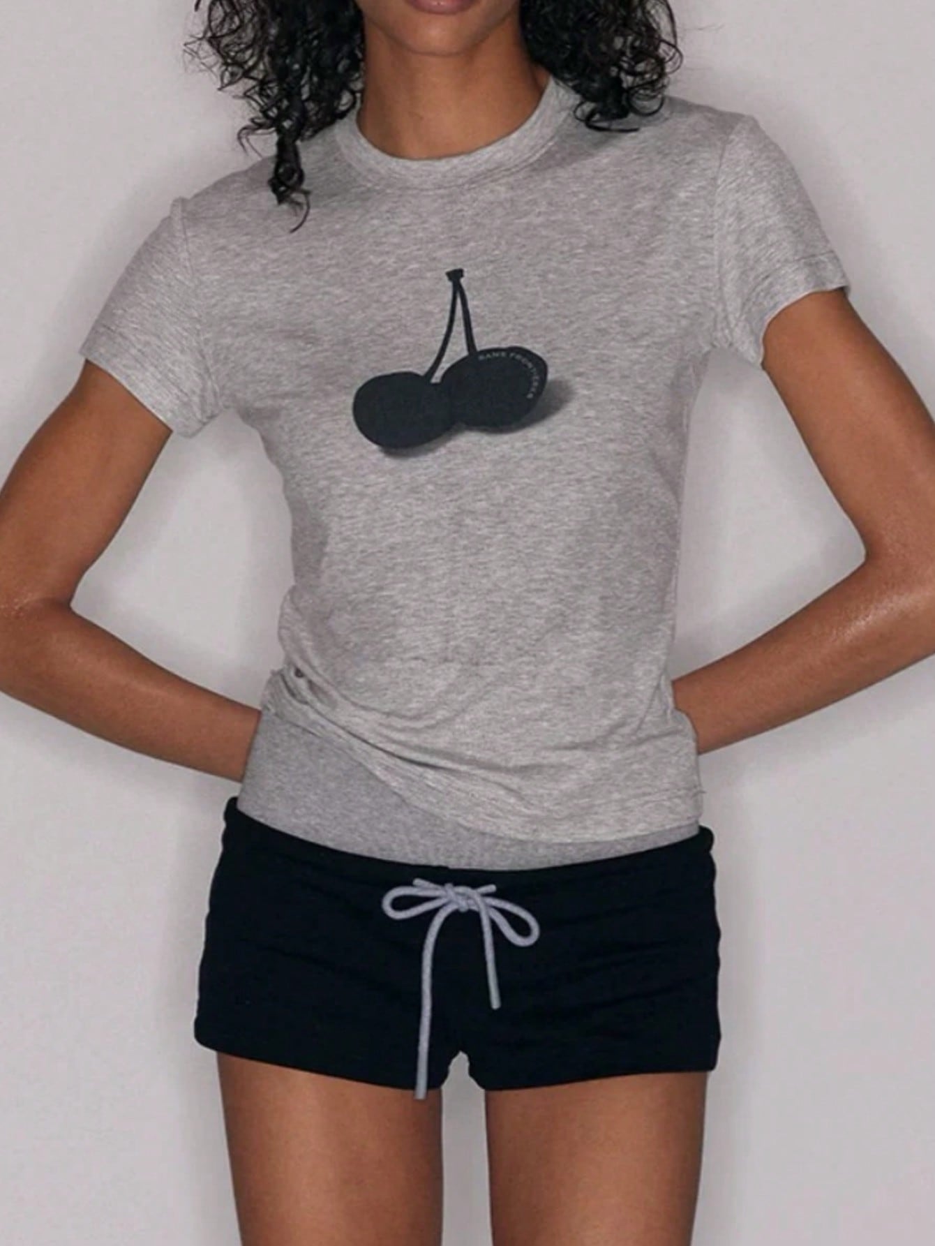 Women's Grey Cherry Print Short-Sleeve T-Shirt, Casual Crew Neck Tee with Cute Graphic for Daily Wear