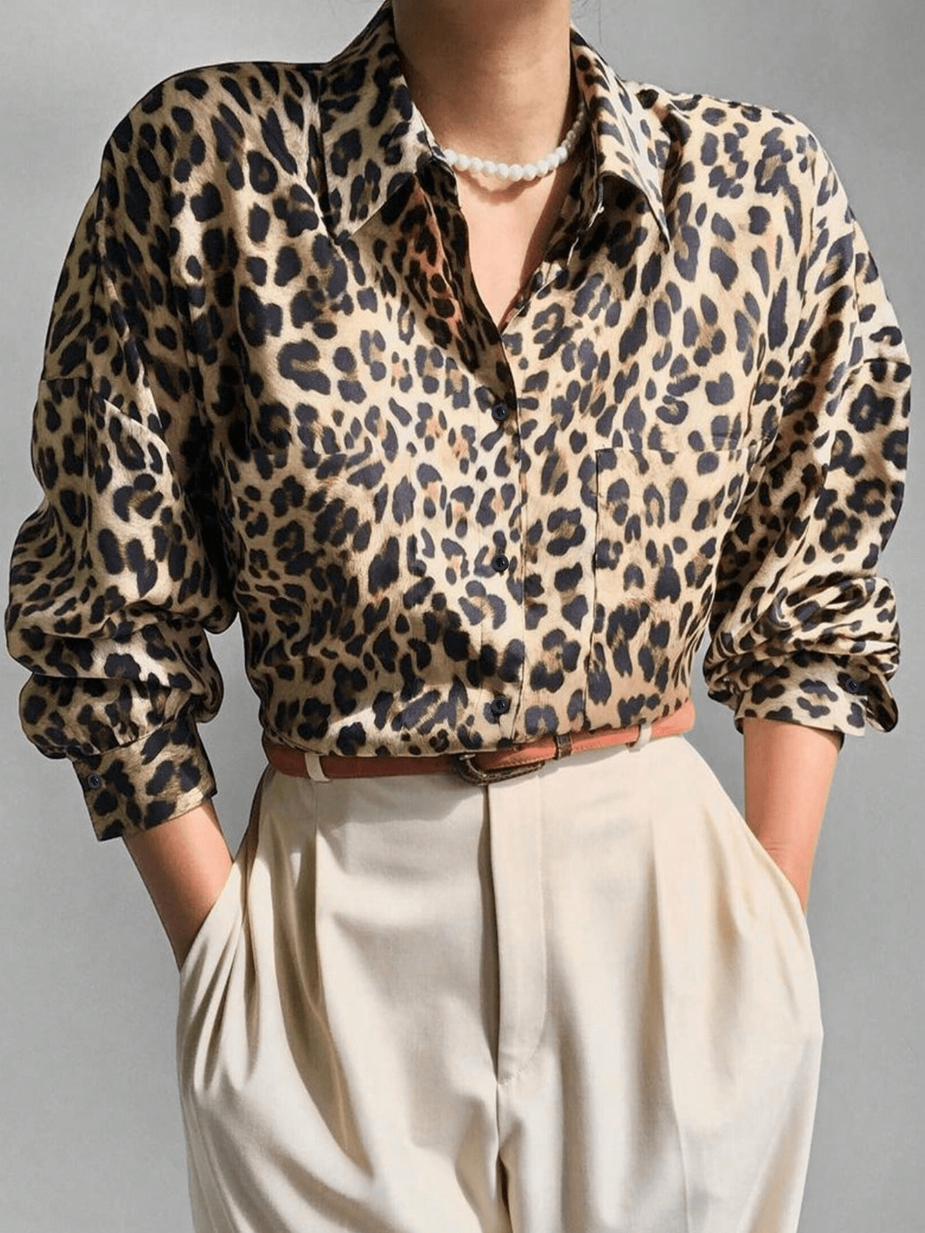 Design Details: Features a long-sleeve silhouette, a classic collar, a button-down front, and an eye-catching leopard print that delivers timeless style.