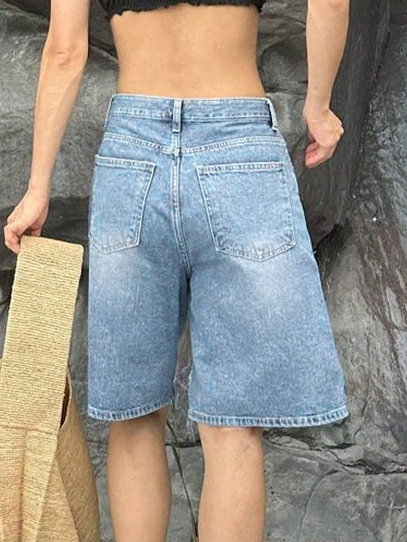 Women's Light Blue Washed Straight Leg Denim Shorts - Vintage Loose-Fit Casual Bermuda Pants
