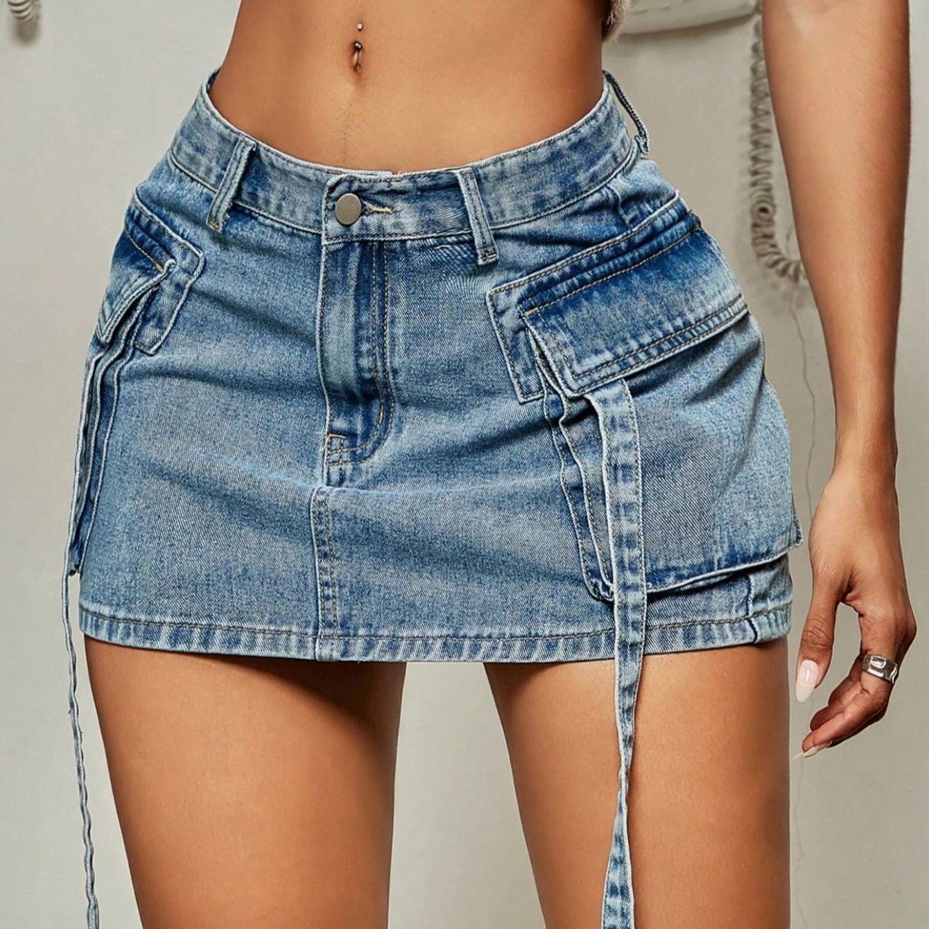 Women's Multi-Color Denim Cargo Mini Skirt - High-Waisted Wrap Skirt with Side Tie Straps, Y2K Streetwear & Casual Summer Wear
