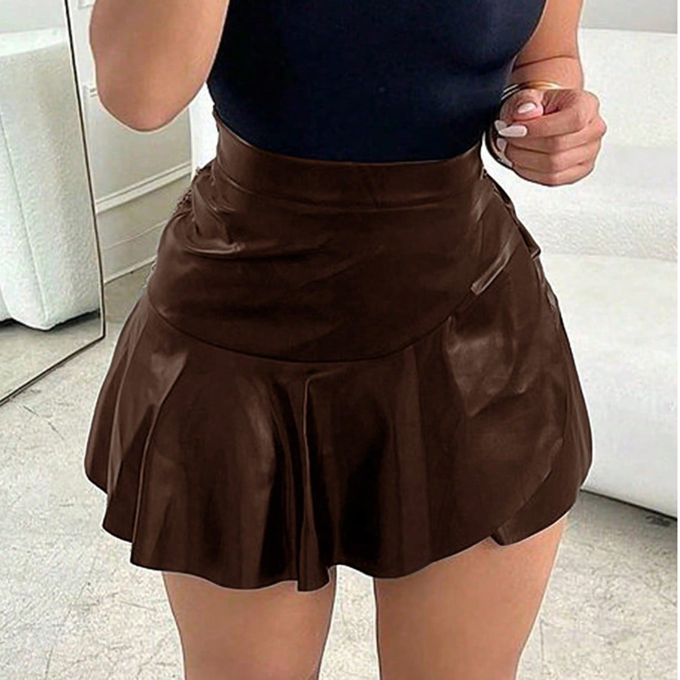 Style Design: Features a high-waisted mini silhouette (accentuating the waistline), faux leather material (delivering a luxe, structured texture), and a ruffled pleated hem (adding playful flair to the polished, bold shape). Available in burgundy, brown, and gray for varied styling needs.