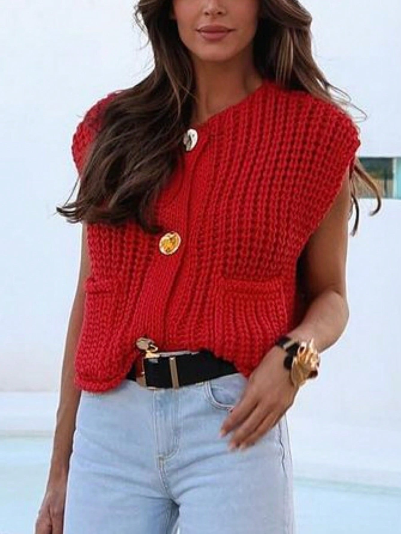 Women's Red Sleeveless Knit Vest - Cropped Casual Fashion Sweater Vest