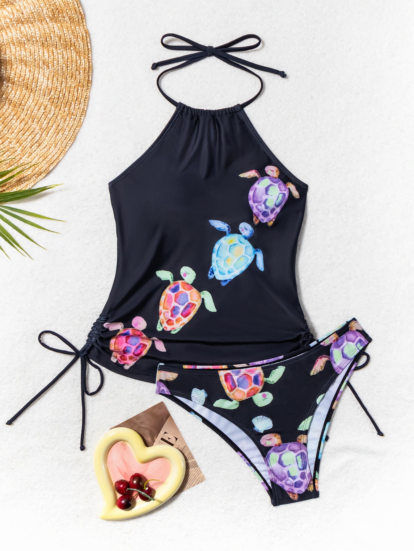 Women's Sea Turtle Print Halter Neck Tankini Set - Drawstring Adjustable Two-Piece Swimwear