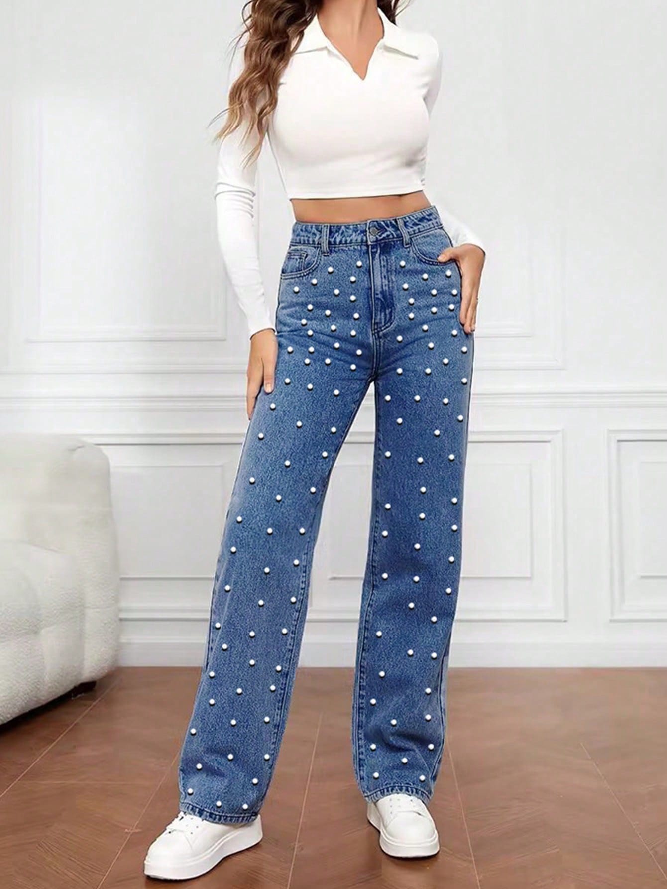 Women's Star Print Wide-Leg Jeans - High-Waisted Casual Denim Pants